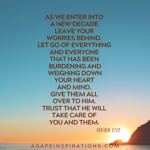 Today is usually a day when people scramble to make their list of goals and objectives for the new year. But as we come to a close of this year and enter into a new decade, let’s consider going into the next season burden free. Don’t take worries and anxieties with you into the next phase of life. Be intentional about what you will allow to occupy your heart and mind. Trust that God has great plans for you and will bring you through every challenge. It’s going to be a great year. You can celebrate in advance for all that is to come. Get ready to receive the unimaginable.