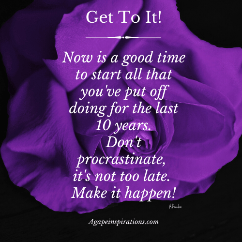 Procrastination is why many of our dreams are deferred. How many projects have you thought of and never started? How many things have you began, but never completed? Perhaps you feel as though it is too late or it will take too long for it to happen. Well my dear friend, time is going to go by no matter what. It’s what you are doing with your time that makes the difference. Don’t put it off any longer. Today is a good day to get started. And every day after that take one step closer to getting it accomplished. Let’s Go and Grow Together!