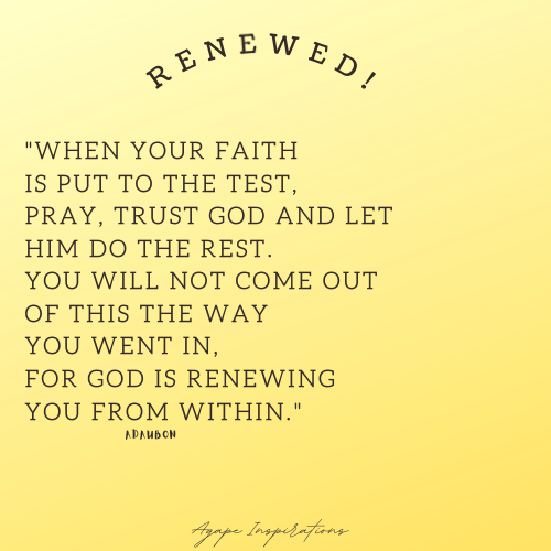 Therefore we do not lose heart. Though outwardly we are wasting away, yet inwardly we are being renewed day by day. 2 Cor. 4:16 (NIV) In our most difficult times, we are growing beyond measure. In the challenging moments of life, we learn to withstand in any type of weather. When everything around you seems to be falling apart, God encourages your heart. You are growing as you go through. Know that God is pouring into you. As we meditate on the verse of the week, trust God to get the glory in your life no matter what you are facing. In the moments where you feel the weakest, God is building your stamina. In your pain you learn God is a healer. When in need you learn God is a provider. When facing sorrow you learn God is a comforter. When in despair you learn how much God cares for you. When you feel depleted you learn that God restores you. Keep pressing forward and be renewed. Let’s go and grow together. ADaubon