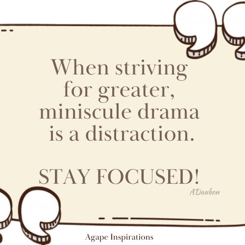 Let your eyes look straight ahead; fix your gaze directly before you. Prov. 4:25 (NIV) Often when we are trying to move forward into a better space, emotionally, financially, spiritually, professionally, personally or overall, it takes a shifting of a mindset. Your focus has to be altered to not be distracted by the things and people that used to easily bait you in the past. In order for change to come the change must first start within you. If forward focus is your goal, then don’t allow yourself to be easily provoked to entertain that which is fruitless. Look straight ahead and keep pressing onward. Let’s go and grow together. ADaubon