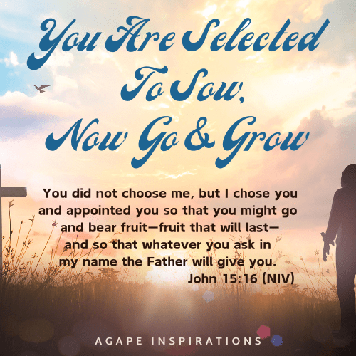 You did not choose me, but I chose you and appointed you so that you might go and bear fruit—fruit that will last—and so that whatever you ask in my name the Father will give you. John 15:15 (NIV) Lord help us to walk in all that you’ve appointed us to. Help us to surrender to what you want us to do. You have selected each of us to sow seeds in the earth in every nation. Stretch us beyond our wildest imaginations. Help us to not shrink back when you are calling us to move ahead. Teach us how to trust you and be Spirit-led. Help us to not waste time and energy on things that are not part of your purpose or plans. Use us as instruments guided by your loving hands. Let the seeds that we sow fall on fertile ground that will bring forth fruit at the appointed hour. We believe you to bring the increase by your mighty power. Use us for your glory as we allow your anointing to flow. We humbly submit to your call to go and grow. ADaubon
