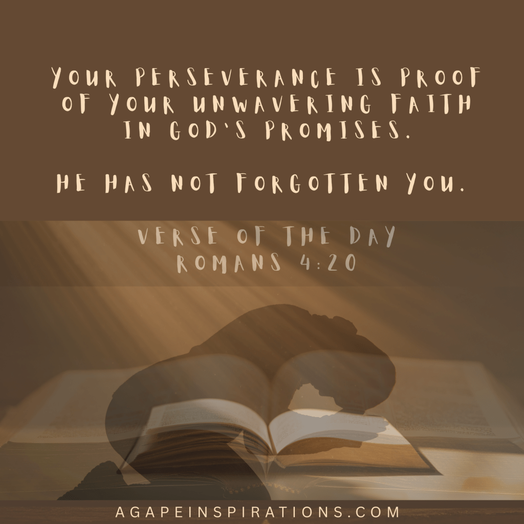 Abraham never wavered in believing God’s promise. In fact, his faith grew stronger, and in this he brought glory to God. Romans 4:20 (NLT) When the situation seems impossible to the human eye, in God’s promises we can rely. Persevere and don’t let your faith waver while waiting for the manifestation of God’s favor. In Him you will find rest in the midst of every test. Instead of sinking you will stand, because you’re being held by His mighty right hand. No need to toil, because good seed has been planted in your soil. All that has been deposited in you will come to fruition in divine timing and His omniscient decision. It is true, you will receive every promise that He has stored up for you. Stay strong as your faith multiplies and you witness what He has promised with your own eyes. I know it seems like the waiting season has been long, but God says hold on. Let’s go and grow together. ADaubon