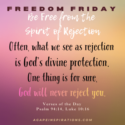 For the LORD will not reject his people; he will never forsake his inheritance. Psalm 94:14 (NIV) Whoever listens to you listens to me; whoever rejects you rejects me; but whoever rejects me rejects him who sent me.” Luke 10:16 (NIV) Often, what we see as rejection is God’s divine protection. When doors close and people change, consider it God’s redirection. When individuals pull away and distance themselves, don’t be alarmed, because you don’t understand. God removes those who are not part of His plan. When people hurt you because they are not healed, don’t let their broken pieces cut you. Don’t let the negative energy from others shift your mood or question your value. Often, it’s the Holy Spirit that illuminates in you that they cannot stand. You won’t crumble when they walk away, because God upholds you with His mighty right hand. You were not meant to be liked by everyone, but rather loved by the One who matters the most. You are the apple of His eye and adored by the Lord of Hosts. Take your disappointments and pain to Him and receive healing from above. One thing is for sure, God cares for you with an everlasting love. Be set free from the spirit of rejection and let go of all that didn’t turn out the way you desired. Trust God is covering you and His plans are to take you higher. Press Forward! ADaubon