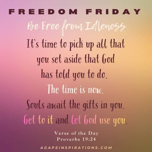 Lazy people take food in their hand but don’t even lift it to their mouth. Proverbs 19:24 (NLT) There is too much unfinished business in the life of believers. God has placed seeds of purpose inside of us to bring forth fruit. Consider today what God has told you to do that you put aside. Perhaps it was a steady decline in effort or an abrupt pause. Before you knew it, days turned into weeks and weeks into years. Do you feel God tugging on your heart to wake up, stop stalling and get back on track? What ideas, ministries, endeavors or visions have you put aside? The time is now to answer the call with wholehearted obedience that is accompanied by action and watch God redeem the time. Press Forward! ADaubon